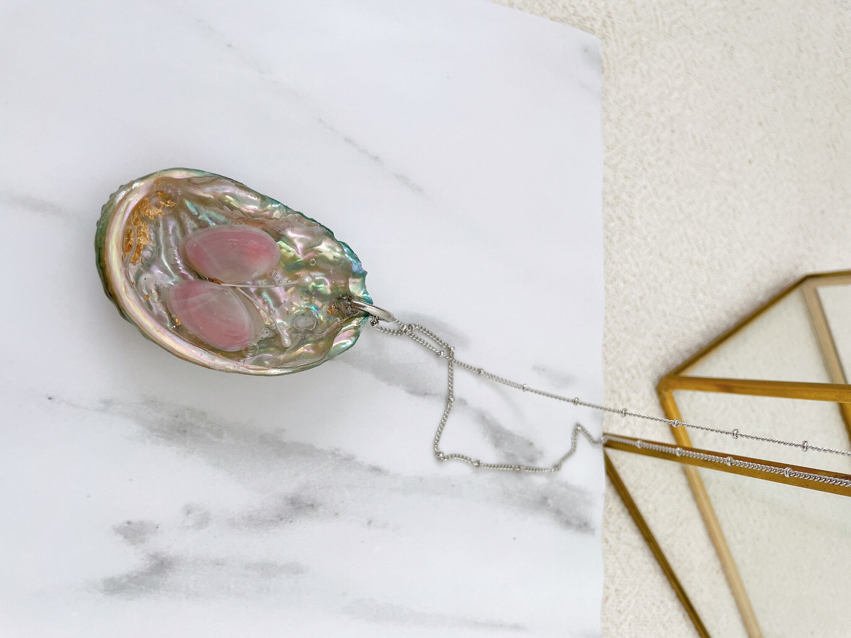 地元で養殖していたアワビを台座に、さくら貝を樹脂で固めたネックレスです。 自然の素材を使っているため、同じ形のものはありません。 一つ一つを手作りしている世界でひとつだけのネックレスです。 ※自然素材を使っていますので台座に使用しているアワビの大きさは微妙に異なります。 ペンダントトップ:4.5cm × 3cm チェーン:55cm ※アジャスター付